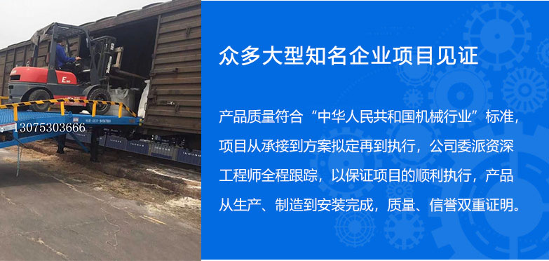 >> 13年的登車橋設備制造經驗 集設計、研發(fā)、生產和銷售于一體的制造型企業(yè),專業(yè)制造液壓登車橋,移動式登 車橋和高空作業(yè)平臺,經驗豐富,擁有強大的成產技術和完善的管理模式。 >> 引進國際先進施工工藝 配備整套專業(yè)自動化生成設備,引進國外先進技術, 定期培訓,確保設備的高品質。 產品具有設計新穎、結構合理、升降平穩(wěn)、載重安全、操作簡單、維護方便等優(yōu)點。